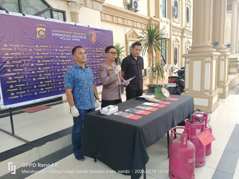 JAMBI,MA – Polda Jambi melalui Direktorat Reserse Kriminal Khusus (Ditreskrimsus) menggelar konferensi pers terkait pengungkapan kasus tindak pidana perlindungan konsumen berupa kecurangan pengurangan isi tabung gas LPG non-subsidi ukuran 12 kilogram.